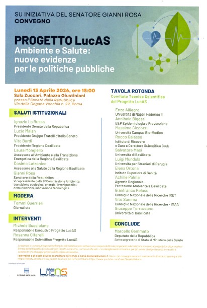 È giunto sino alle porte di Palazzo Giustiniani il Progetto LucAS, incentrato non soltanto sull’Ambiente ma anche sulla Salute di tutti i cittadini, in un binomio che appare sempre più indissolubile.